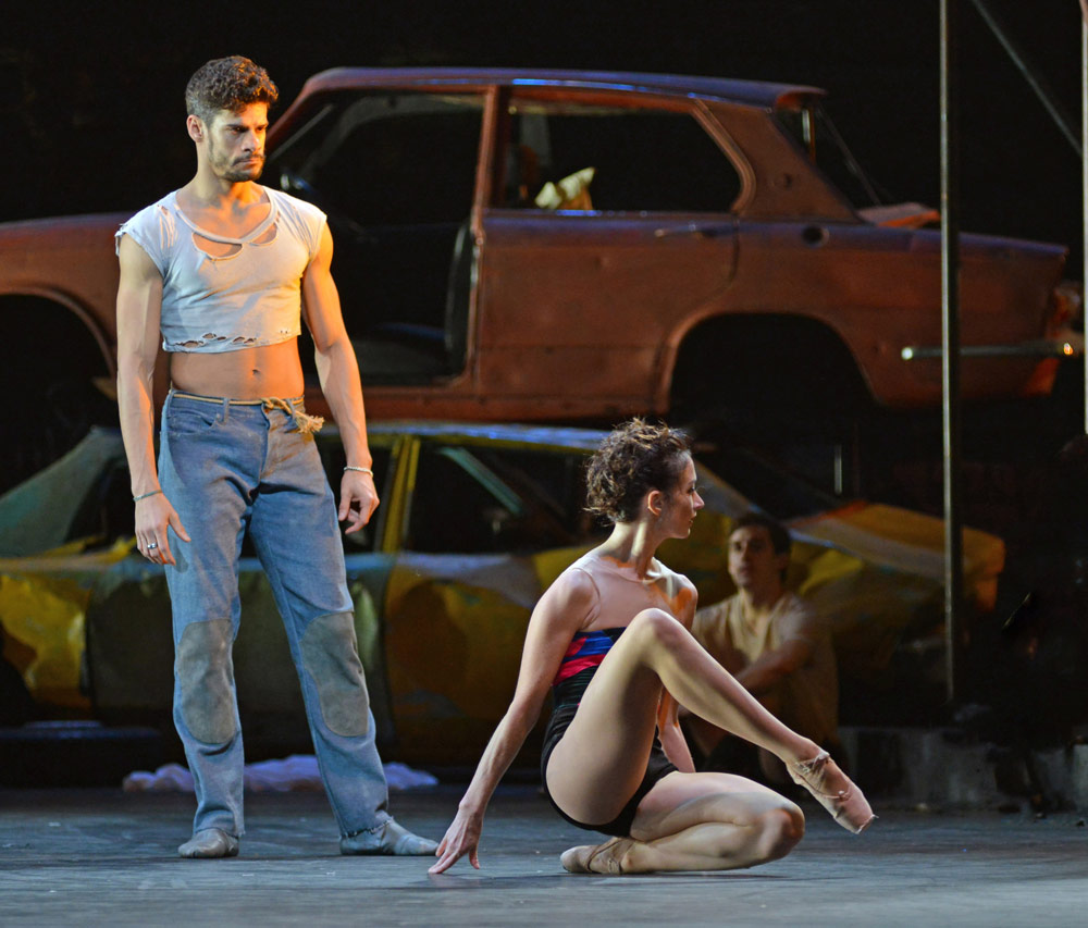 Lauren Cuthbertson as the woman owns her sexuality, claiming the right to walk over the backs of the men on the building site. She is nominally the girlfriend of the Foreman, Thiago Soares, but she treats him with seductive contempt, taunting him, as she does the other two principal men, Edward Watson (as Jesus) and Reece Clarke (as Peter). Cuthbertson flaunts her long legs like weapons, flicking a man’s chin or pawing his crotch. This is an aspect of her theatrical personality she hasn’t had the opportunity to reveal before, very different from her girlishness as Alice in Wheeldon’s Lewis Carroll ballet.